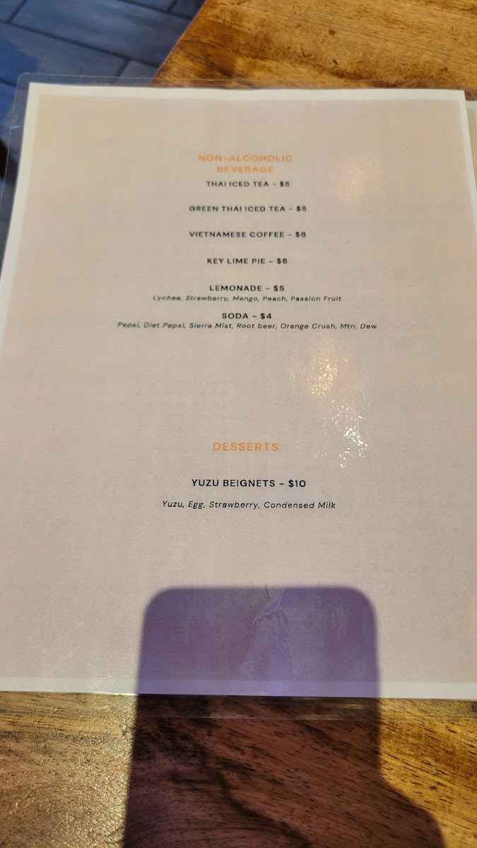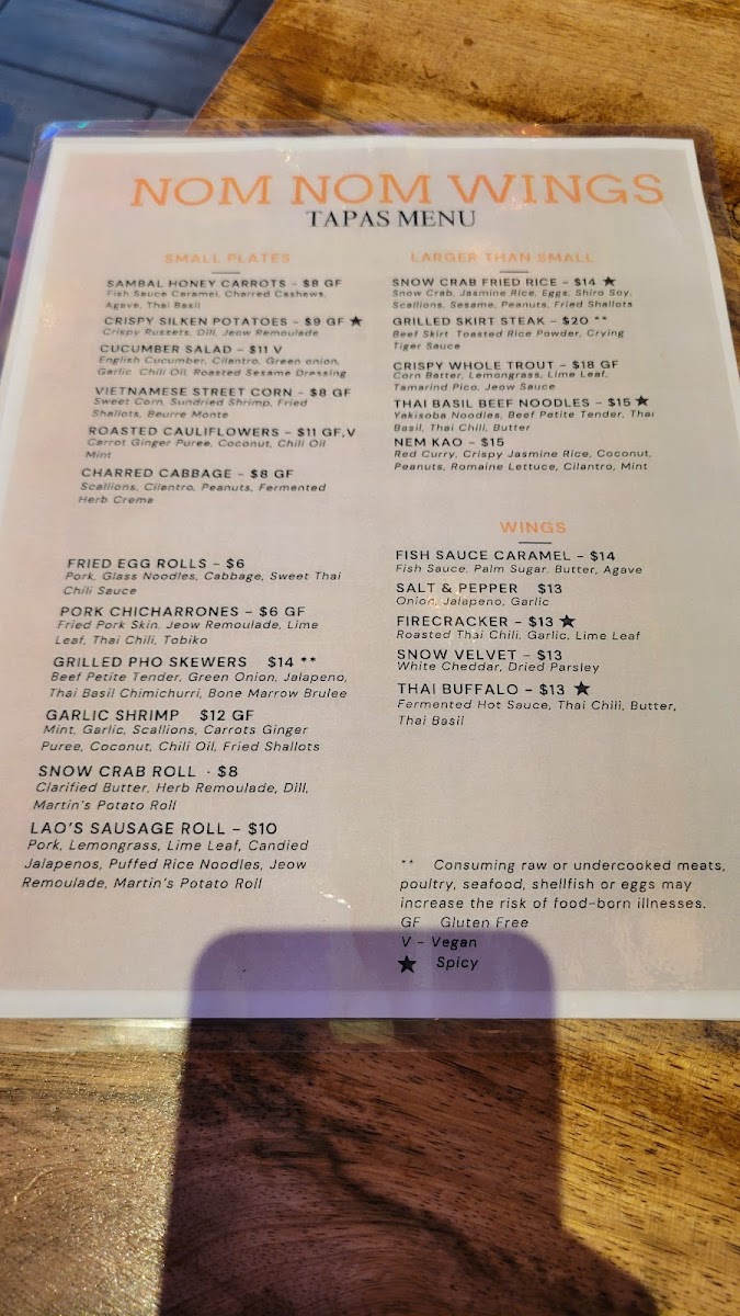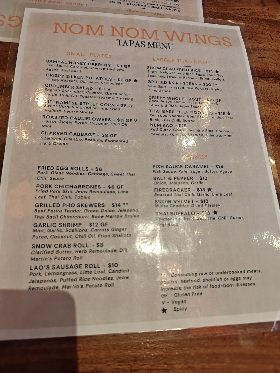 The SMALL PLATES section highlights creative vegetable-forward dishes like SAMBAL HONEY CARROTS, ROASTED CAULIFLOWER, and CHARRED CABBAGE, alongside indulgent options such as FRIED EGG ROLLS and FRIED POTATOES, making it ideal for sharing. For heartier appetites, the LARGER THAN SMALL plates deliver depth and substance with standout choices like SNOW CRAB FRIED RICE, GRILLED SKIRT STEAK, FRIED WHOLE TROUT, THAI BASIL BEEF NOODLES, and NEM KAO, all reflecting bold flavors and confident execution. Rounding out the experience, YUZU BEIGNETS provide a light yet memorable citrusy finish. Overall, Nom Nom Asian Tapas And Bar’s menu feels cohesive, generous, and well-curated-perfectly summarizing a dining experience that blends comfort, creativity, and global inspiration into one satisfying conclusion.