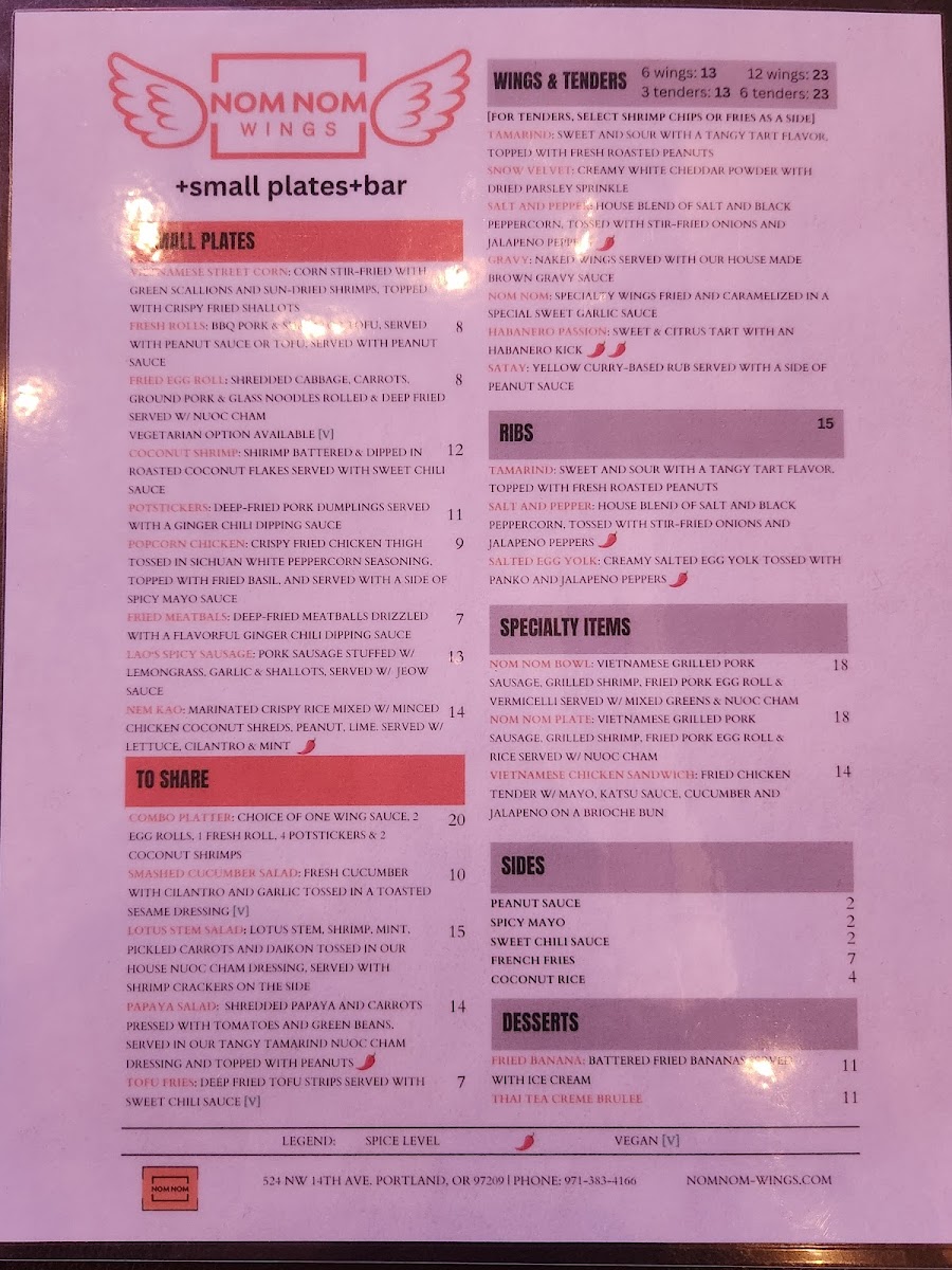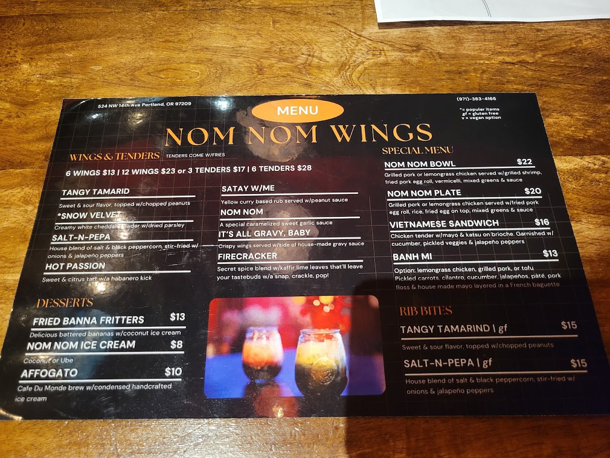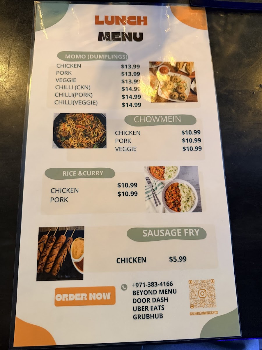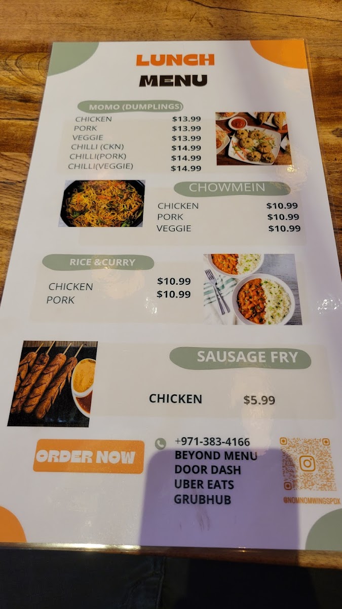 As a final takeaway, the menu at Nom Nom Asian Tapas And Bar at 524 NW 14th Ave, Portland, OR 97209 feels like a thoughtful celebration of Asian flavors with a strong Nepalese influence, presented through a modern tapas-style lens. From the Nepalese lunch offerings, dishes like MOMO (Nepalese Dumplings), CHOWMEIN (Nepalese Stir Fry Noodles), and RICE AND CURRY made with Nepalese spices stand out for their comforting, homemade character, clearly crafted with “full of flavor and love.” The menu transitions seamlessly into crave-worthy bar bites such as SAUSAGE FRY (1 serve equals 3 pieces) and a diverse selection of WINGS including Fish Sauce Caramel, Salt & Pepper, Firecracker Snow Velvet, and Thai Buffalo, each offering a distinct balance of heat, sweetness, and umami.